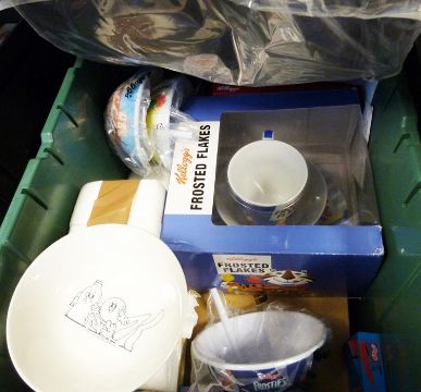 Kellogg's collectables to include Tony the Tiger Grand Prix made by Wade, Tony the Tiger Wade, another money box, Tony the Tiger milk bottles with straws, Kellogg's stainless steel cutlery, a Kellogg's chicken transistor radio, Kellogg's carrier bag, box Frosted Flakes set, etc. (2 boxes)