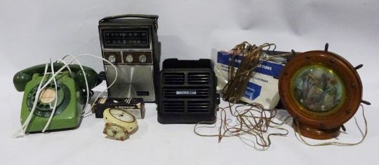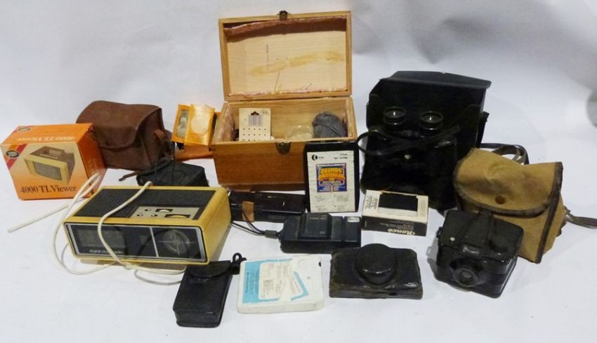 Vintage toys to include a spinning top, a slinky, a globe, cigarette cards, Etch-a-Sketch in original box, vintage radios, vintage cameras, a magic lens, featherweight camera (3 boxes), and The Adventures of Wonk Ladybird book plus assorted ceramics to include Midwinter Roselle (5 boxes)