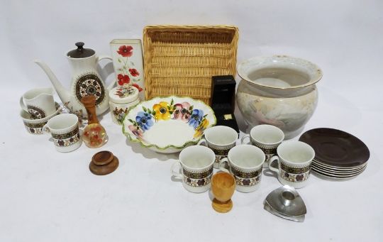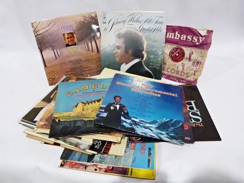 Quantity of long playing records to include Portrait of Sinatra, two South Pacific record s, the Fabulous Shirley Bassey, Your Hundred Instrumental Favourite Instrumental, Memories are made of Hits, etc., assorted ceramics, bread basket, fire irons, a vintage mixer, table lamps, glassware to include glass lemon squeezer, pint glasses, vases, carved wooden lion, terracotta flowerpots (four boxes plus records)