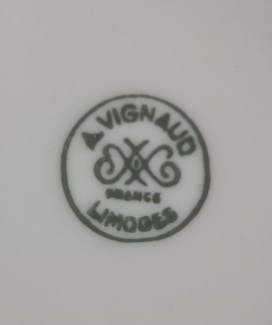 Limoges 'A.Vignaud' part tea and coffee service including a coffee pot and cover, a two-handled sugar bowl and cover, a milk jug, two teacups and saucers, 20th century, with printed green marks