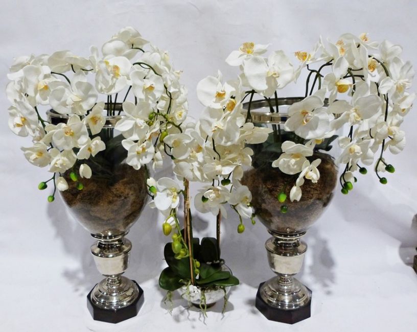 Two large silver coloured metal and glass vases with faux orchids displayed, and a glass bowl of three white faux orchids