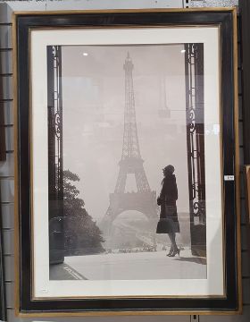 Print of a 1940's view of Paris with woman standing in front of the Eiffel Tower, 89cm x 60cm