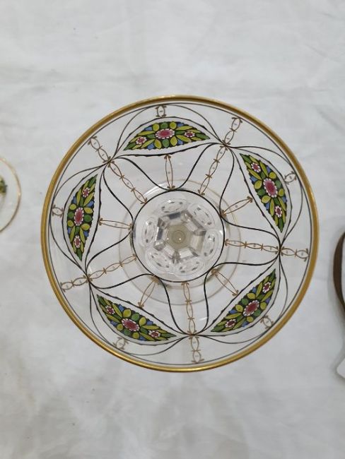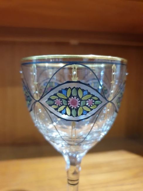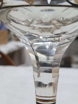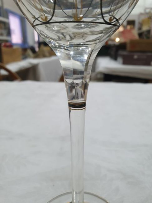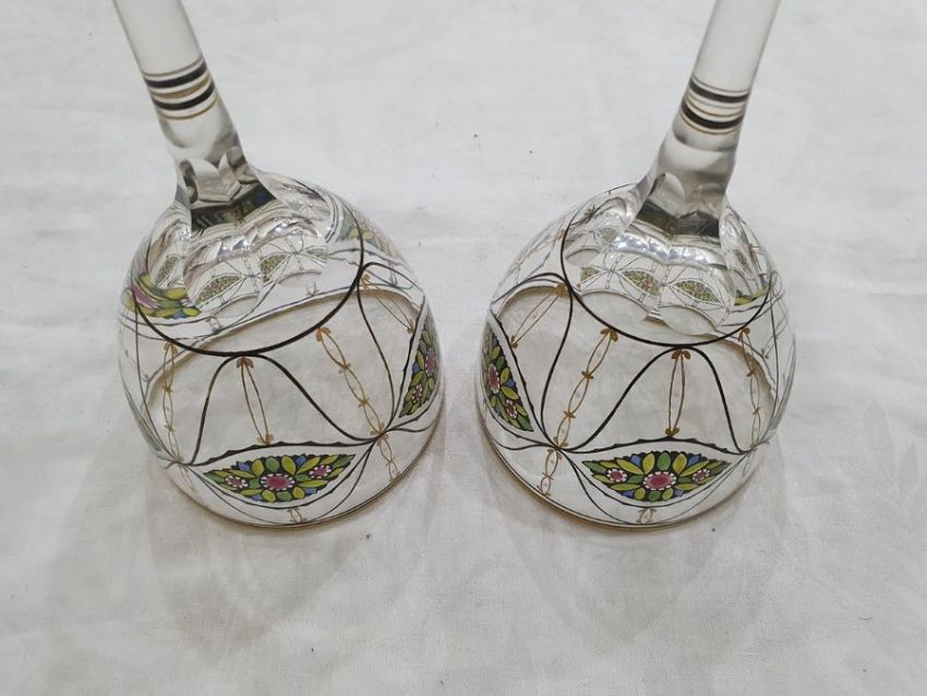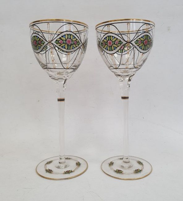 Pair of wine glasses on slender stems in the manner of Theresienthal, the bowls and feet painted with stylised floral decoration and with gilt rims, 20cm high (2) Condition ReportOverall good condition.  Some light surface marks, a small fleabite to the top of one stem, minor wear to the gilt in a couple of places.  See photos