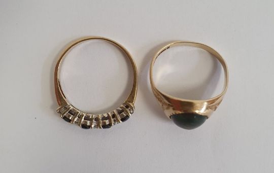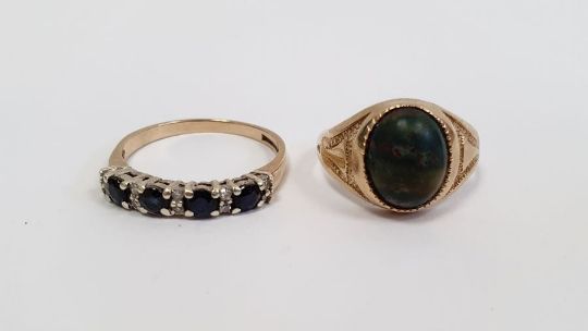 **** WITHDRAWN **** 9ct gold and four stone sapphire ring with diamond points, finger size M and a 9ct gold ring set with a bloodstone cabochon, finger size H1/2, approx. total weight 4g (2) **** WITHDRAWN ****