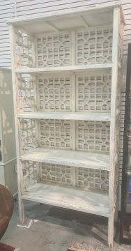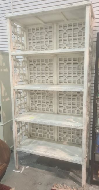 20th century white painted shabby chic style shelving unit in the Oriental taste, carved and pierced sides and back, with four shelves