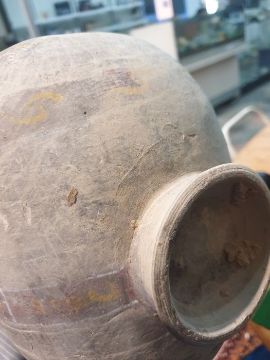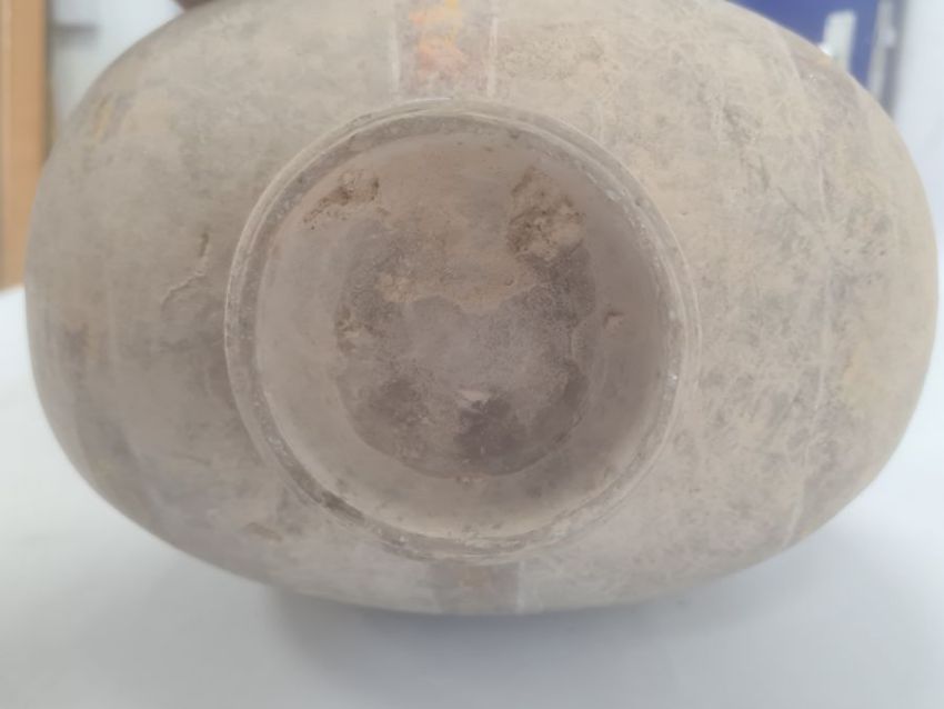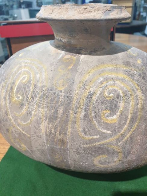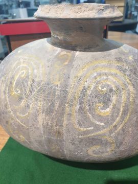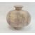 Earthenware vase with barrel-form body, flared neck and foot, white and yellow scroll decoration, unglazed, 24cm high Condition ReportScratches and fading throughout.Chip to rim.No sign of cracking.