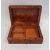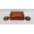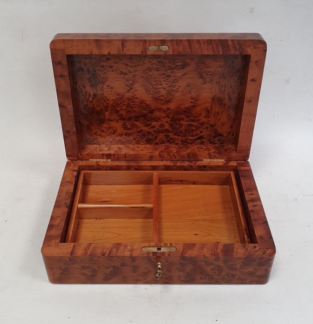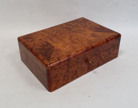 Modern burrwood box of rectangular form with fitted interior, 26cm long and a pair of matching tea light holders, 11cm diameter.