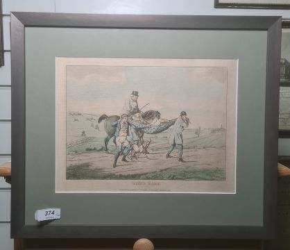 After Henry AlkenSix hand coloured etchings, 'Going at a chalk pit, gravel pit or river', 'Going at a fence', 'How to appear at cover', 'How to stop your horse', 'Going home' and 'Going at a gate' (6)