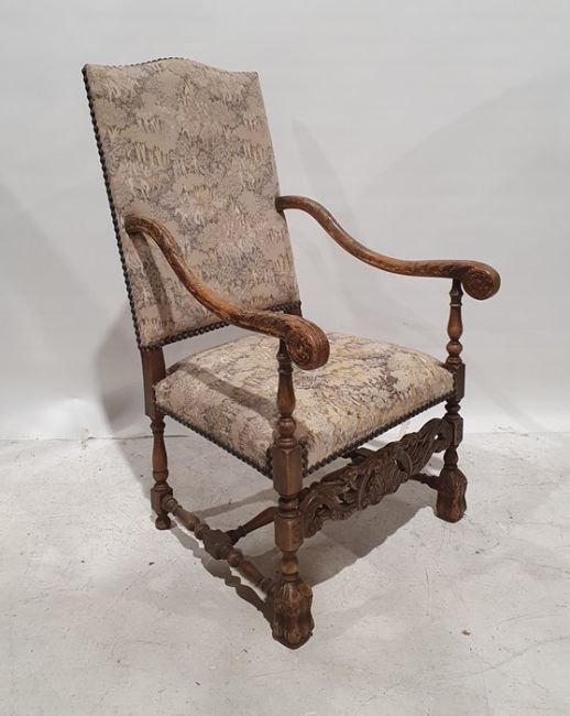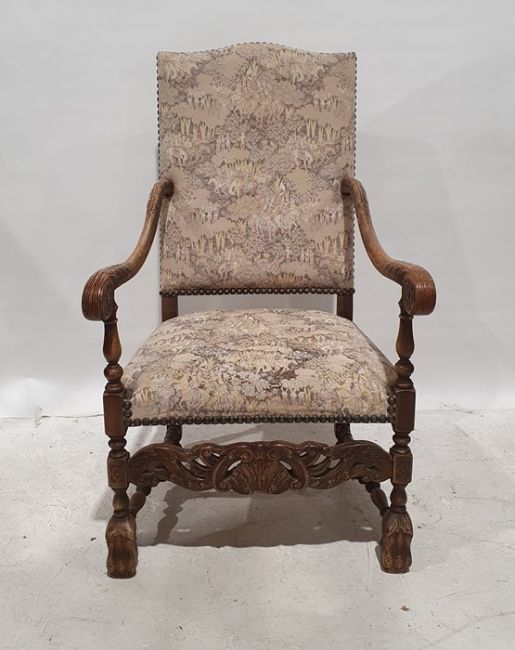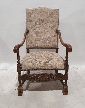 Early 20th century Carolean-style armchair with upholstered seat and back, acanthus carved arm rests, turned, block and carved supports, carved and pierced stretcher