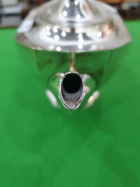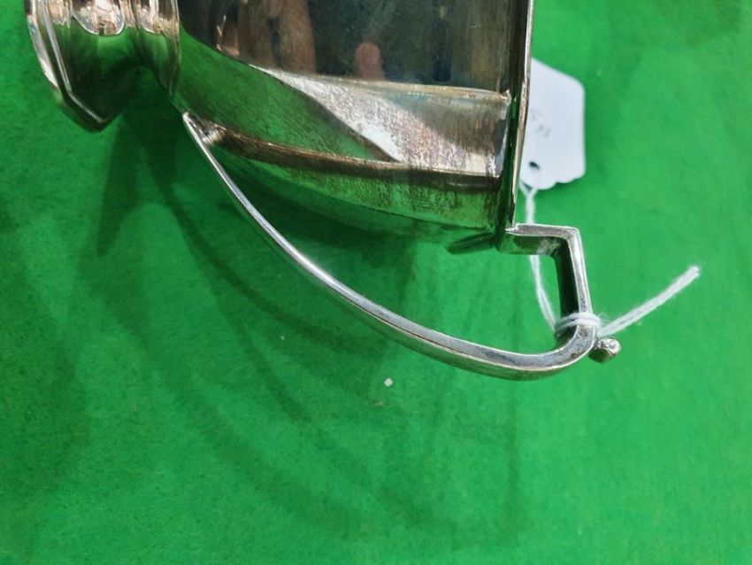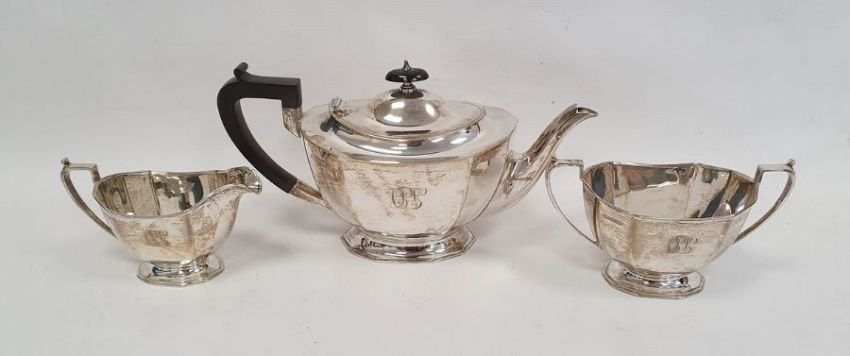 Silver three-piece tea set by Frank Cobb & Co Ltd, Sheffield 1939, comprising teapot, two-handled sugar bowl and milk jug, all of panelled form with engraved monogram, approx total weight 29oz (3) Condition ReportLight surface scratches and tarnishing.  General wear and tear.