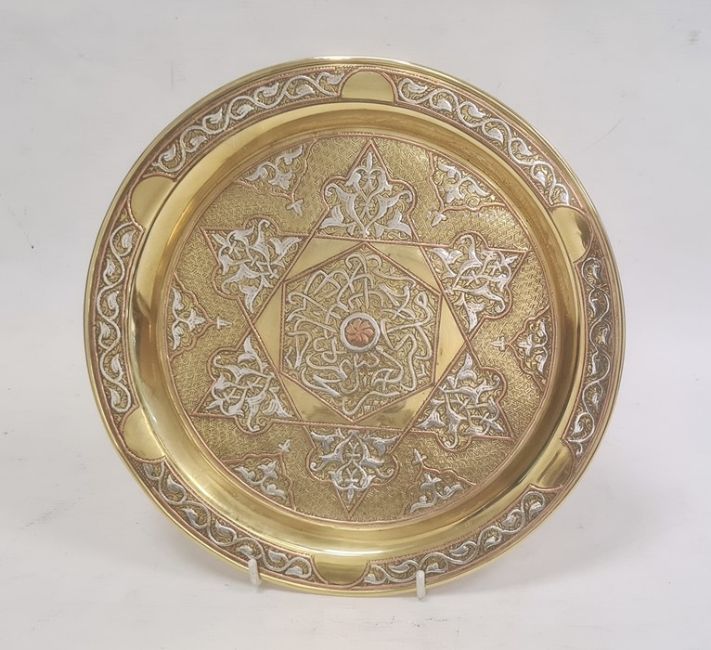 Middle Eastern brass dish of circular form with inlaid copper and silvered decoration, 24.5cm diameter