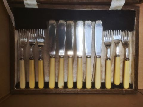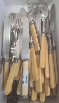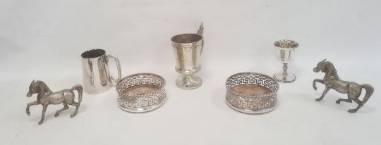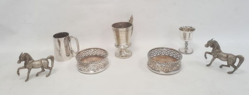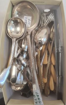 **** WITHDRAWN ***** Pair of silver plated wine coasters with pierced Greek key decoration and ropetwist borders, a Victorian silver plated trophy for Clifton College Cadets, assorted silver plated cutlery, etc (1 box) ***** WITHDRAWN ****