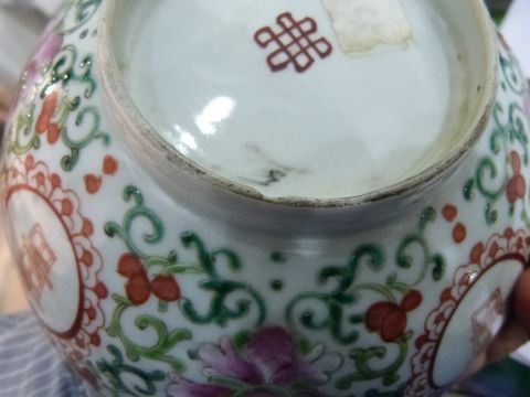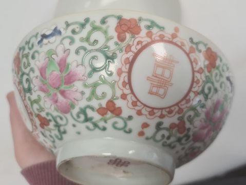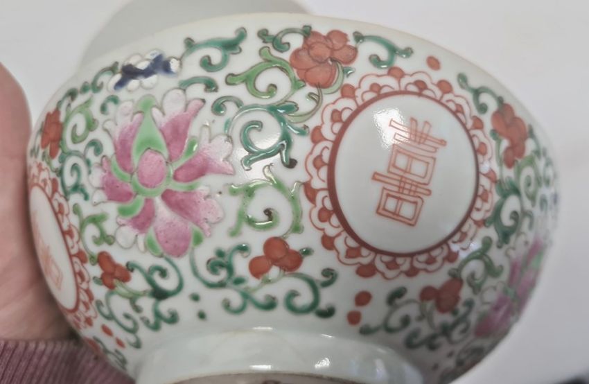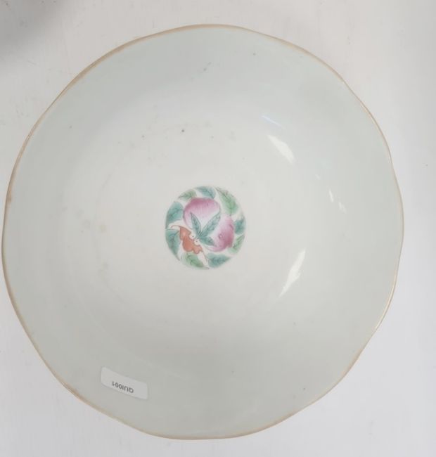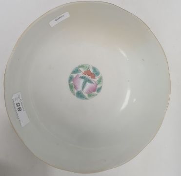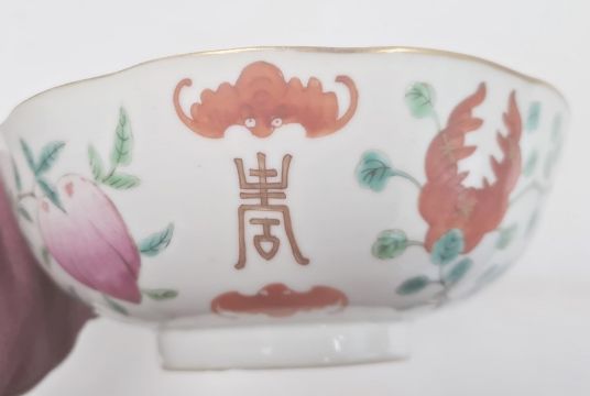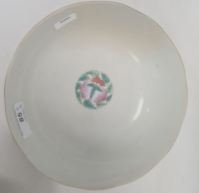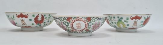 Pair of Chinese bowls, the exteriors with enamelled decoration of fruit, bats and character marks, red character mark to bases, 19cm diameter and another Chinese bowl with enamelled floral and scrolling decoration (3) Condition ReportSome minor paint loss, marking and surface imperfections throughout.Chip to base of smaller bowl.
