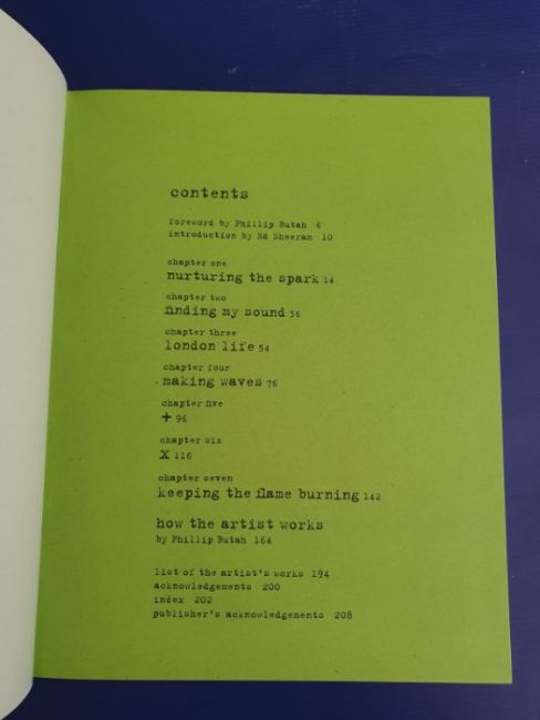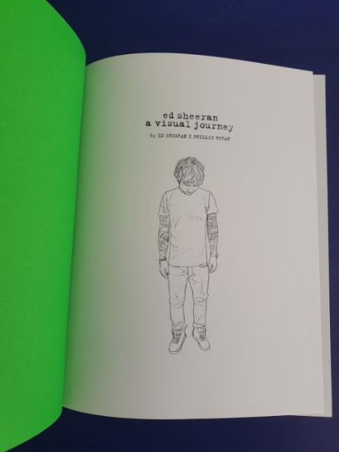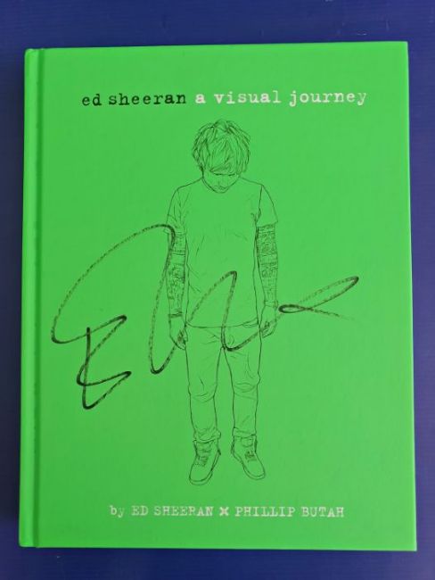 Sheeran Ed.  " A Visual Journey" Cassell 2014,  his autobiographyof his life, from busking to Madison Square Garden, including pictures of Ed by the artist Philip Butah, green pictorial cloth, signed on the front cover by Ed Sheeran, 85.5 x 79 x 4 cmBeing offered for Charity BOOKS NOT COLLATED UNLESS OTHERWISE STATED, PLEASE ENSURE YOU ARE SATISFIED BEFORE YOU BIDCondition Report