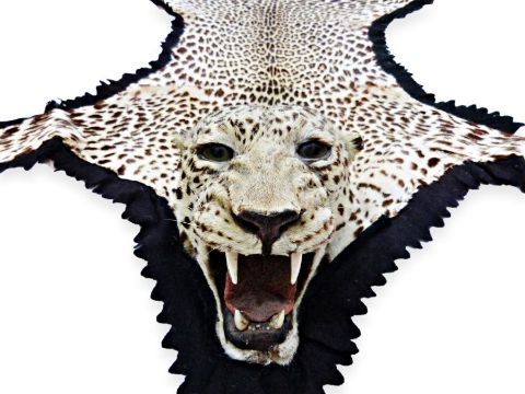 Early 20th century leopardskin by P Spicer & Sons of Leamington, the taxidermy head with open mouth and glass eyes, the skin mounted on felt backing, with label, 224cm long