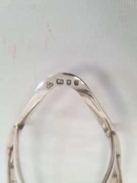 Silver six-division toast rack by Nayler Brothers, London 1989 of shaped oval form with ring handle, 18cm long, approx. 4oz (damaged)
