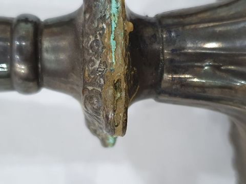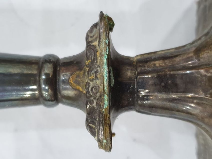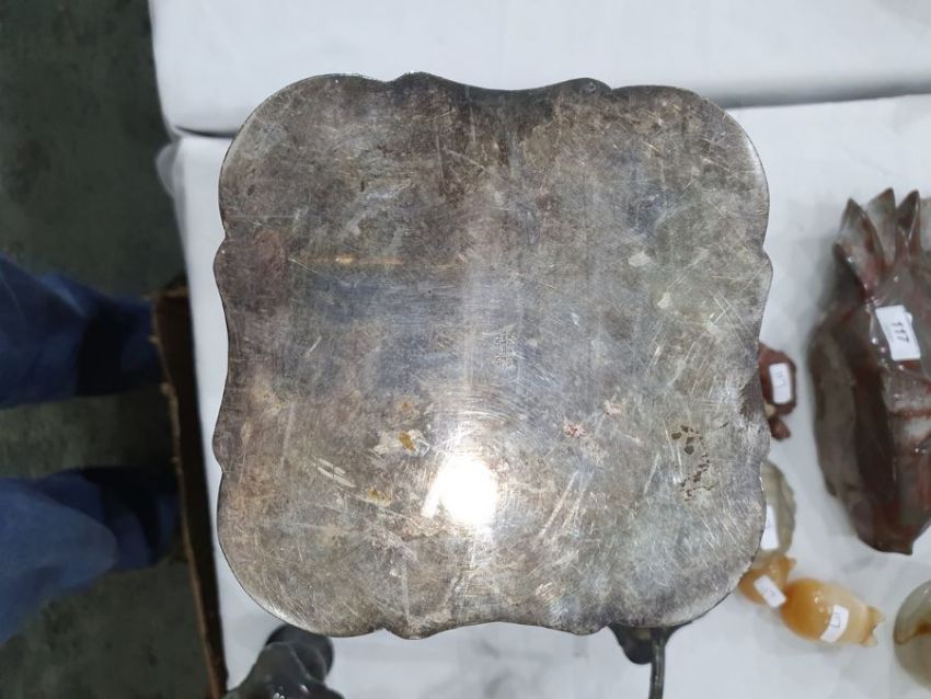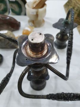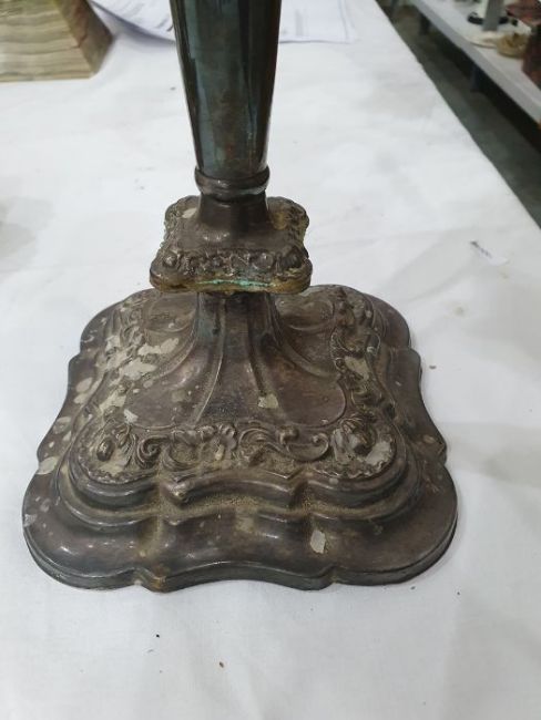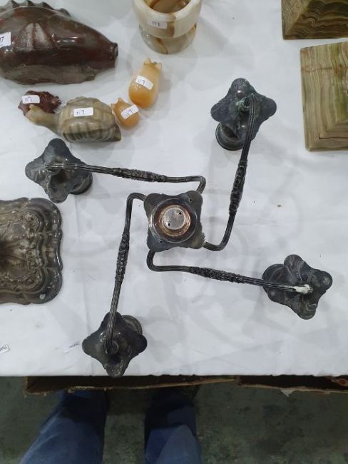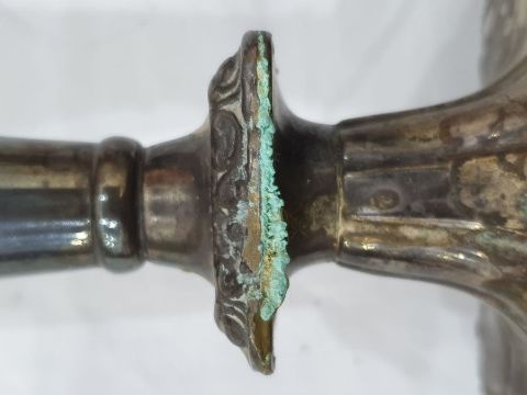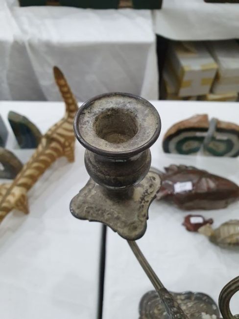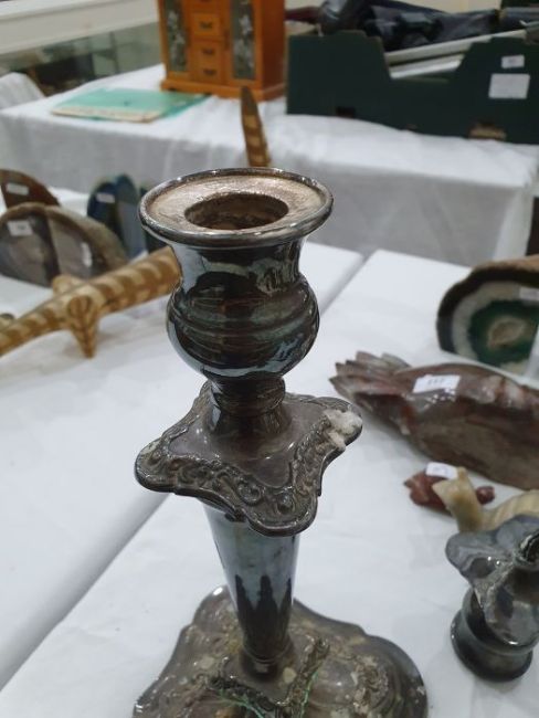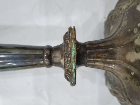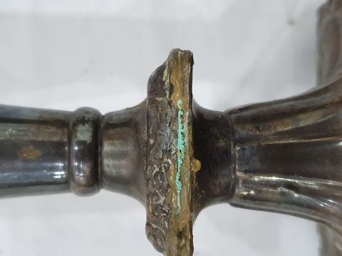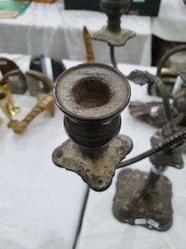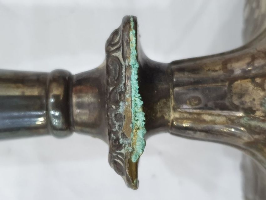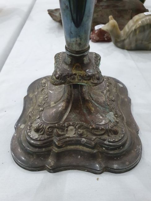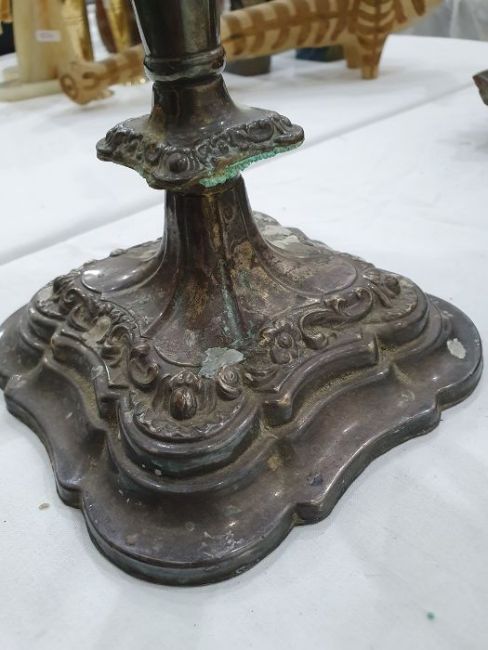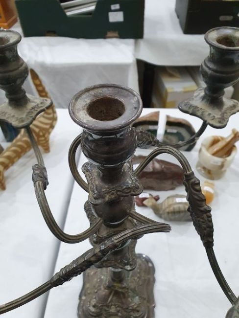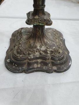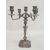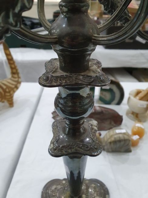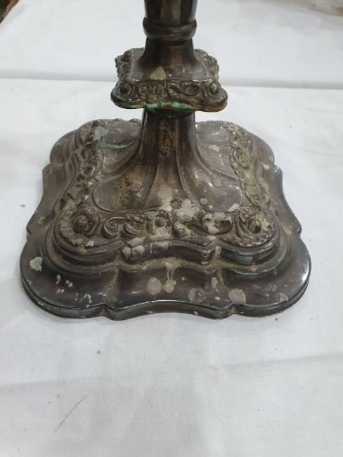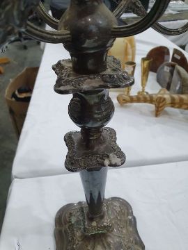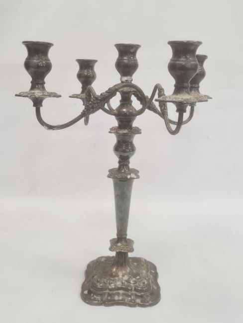 Silver plated four-branch candelabrum on shaped square base, convertible to candlestickCondition ReportSome surface scratches, tarnishing, accretions and wax.  Old repair towards the bottom.  See photos.