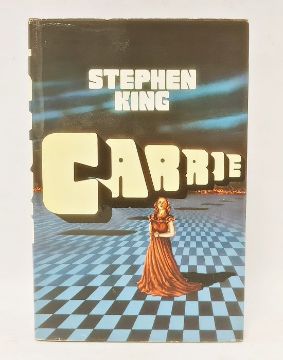 King, Stephen " Carrie" The New English Library 1974, some toning to edge of pages, purple cloth, slight bruising to top and bottom of spine, gilt titles, d-j, not price clipped, please note that there is a staple in the top of the inside flap of the front dust jacket. Been there some long time, slight impression opposite on the end paper