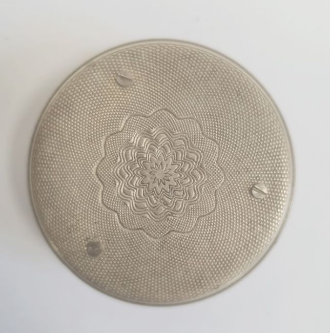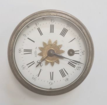 Travelling alarm clock of circular form, the enamel dial with Roman numerals, outer seconds dial and inner gilt metal alarm dial, in engine-turned silver-plated case, 5.5cm diameter