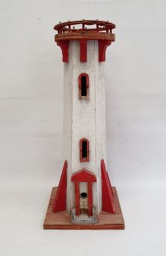 Wooden model of a lighthouse painted in red and white, 68cm high
