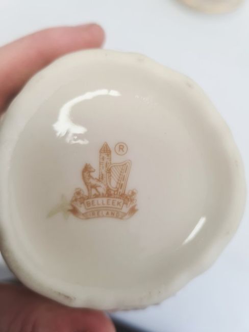 Royal Doulton model dog, Belleek porcelain vase, Shelley vase, Bunnykins plate, Murano-style fish ornament, and other items
