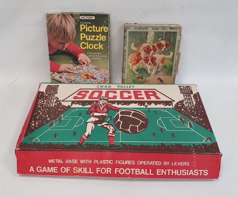 Chad Valley table soccer set, a Victory picture puzzle clock and a set of picture building blocks (3)