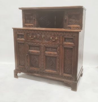 Reproduction oak court cupboard in the Elizabethan taste, with cupboard doors to top above single drawer and single cupboard door under, on bracket feet, 121cm wide x 128cm high