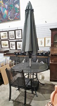 Garden table, parasol and two pairs of chairs (6)