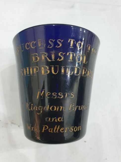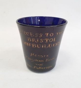 Victorian Bristol blue glass tumbler commemorating the Great Western with an etched and gilded depiction of the steamship, titled and dated 1838 and inscribed verso 'Success to the Bristol Ship Builders Messrs I Kingdom Brunel and Wm Patterson', 10cm high Condition ReportSome light surface scratches, wear to the gilt.  No chips or cracks.