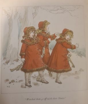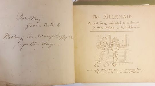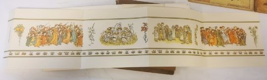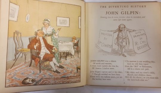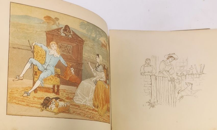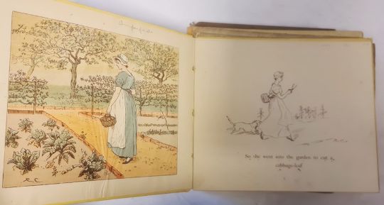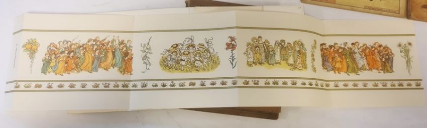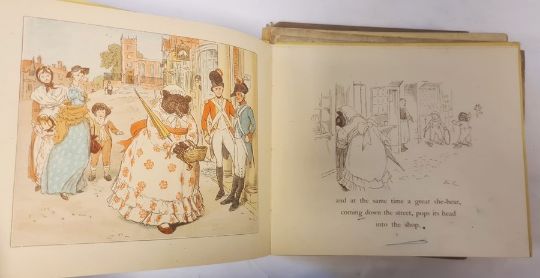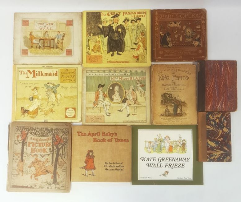 Greenaway Kate " The Royal Progress of King Pepito" London,  the Society for the Promotion of Christian Knowledge, (1889) frontis, ills, offsetting on ffeep, front board detaching, backstrip titles missing,  "  The April Baby's Book of tunes", MacMillan and Co (1900) ,  col plates and ills ,  musical scores, pictorial boards, red titles,  A Kate Greenaway Wall frieze , modern, Crane Walter  " A Baby's Opera" George Routledge & Sons, binding, loose , bumped and rubbed, Caldecott's " The Great Panjandrum Himself" Frederick Warne & co. pages missing, pictorial boards, " Mrs Mary Blaize - An Elegy on the Glory of her Sex" , ills, limp covers, " The Millkmaid" ills. limp covers, not complete, "Caldecott's Picture Book...." containing various stories, George Routledge,  ills, loose pages, "The Comic Almanac for 1846"  David Bogue, rebound, Ashford Daisy " The Young Visitors",