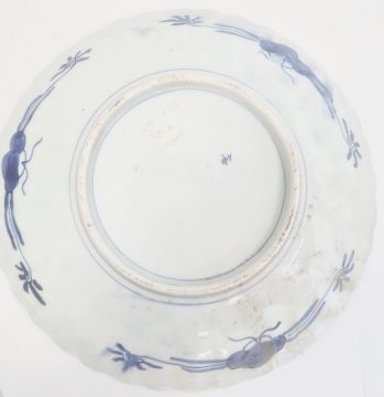 Japanese Imari plate with wavy rim decorated with a central roundel of a vase of flowers surrounded by further decorative panels, 30cm diameter.  Another Japanese Imari plate, the central roundel decorated with a dragon surrounded by alternating red and blue decorative panels, 31cm diameter and another Japanese Imari plate (3)