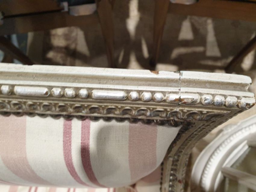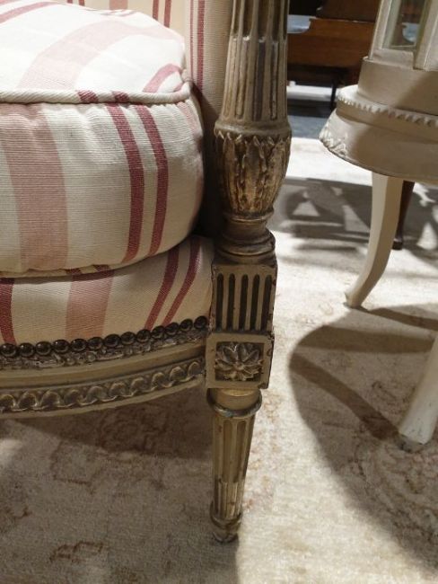 Pair of French-style armchairs with carved cream painted show frame, upholstered in cream and pink stripes (2) Condition ReportPaint-loss and chipping throughout.Some staining to upholstery.