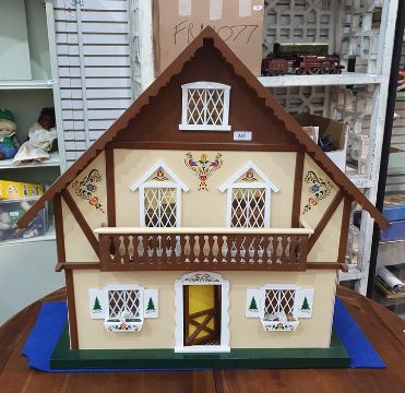 Modern wooden doll's house in the form of a chalet, with painted decoration