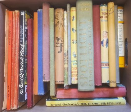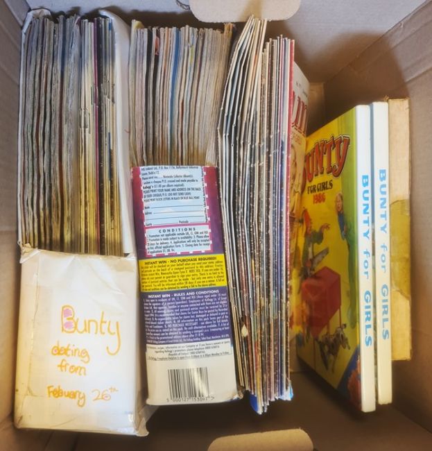 Childrens books including Girls Annuals 7 & 8, Swift Annuals Nos. 5 & 6, Puffin Annuals, Dandy book, Bunty for Girls, Jackie 1981 and 1980, Bunty magazines for girls through the 90's and various other annuals including Uncle Mac's Childrens Hour Story Book, The Tiptop Book, TV Comic Annual, etc (3 boxes)