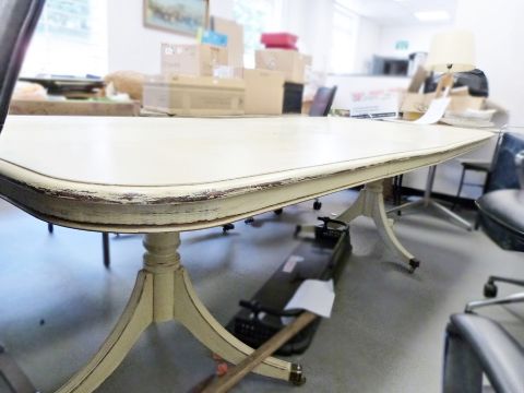 Reproduction Regency extending dining table, the rectangular top with rounded corners, moulded edge, the whole painted cream, twin turned pedestal to swept feet, brass caps and castors, approx. 255cm when extended
