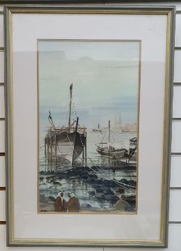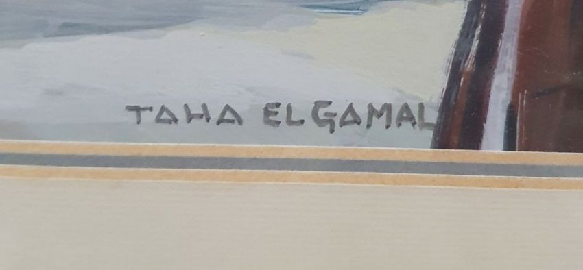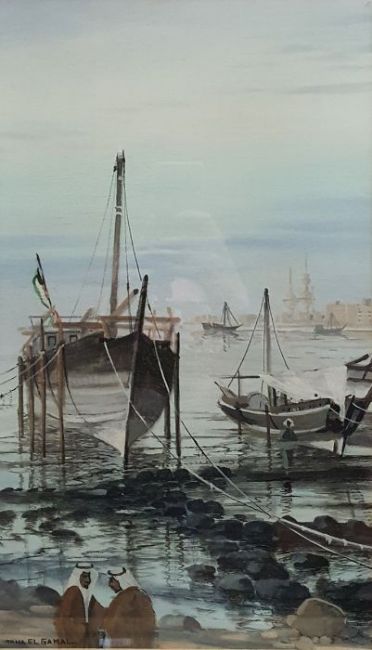 Taha Elgamal - 20th centuryOil on boardPersian river scene with ships in a harbour, signed lower centre, 50 x 40cm together with two further oils of river scenes by the same artist (3)