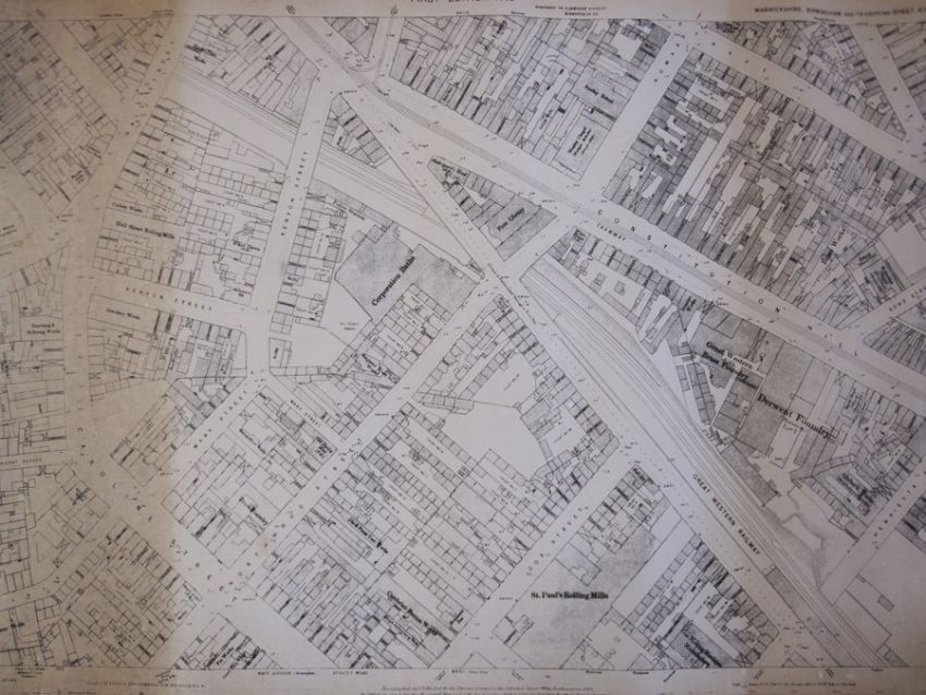 Drawing plan 'Warwickshire, Birmingham and its Environs Sheet 14.5.1', first edition 1889, showing St Paul's Church, Globe Foundry and another 'Warwickshire, Birmingham and its Environs Sheet 14.1.21', Zincographed and published at the Ordnance Survey office Southampton 1889 (2)