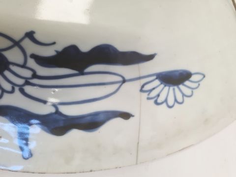 Large Japanese Imari charger with asymmetrical decoration including two panels of trees and birds, on a scrolling floral ground, 61cm diameter