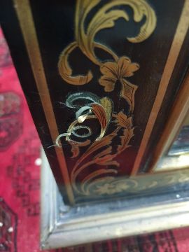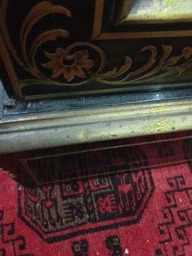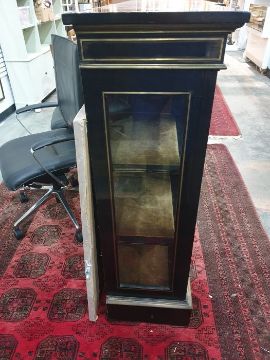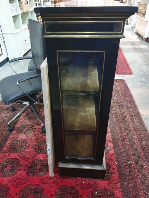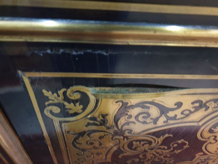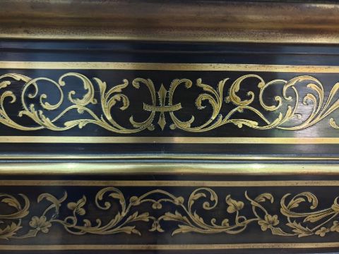 19th century boulle-style inlaid hardwood breakfront credenza, the ebonised top with brass inlay decoration, the front with centre door flanked by pair glazed doors, all with decorative brass inlay, the central cupboard door with Indian-style figure, all on plinth base, 183cm x 124.5cmCondition ReportKeys are present.Parts of Inlay damaged (but no losses) to the bottom right of the center door and bottom left of the left door. Denting across bottom rim. Some wear throughout.Doors do not appear warped.Glass and locks appear original. No obvious signs of woodworm.Shelves are removable, but there are no extra shelf supports.