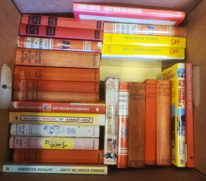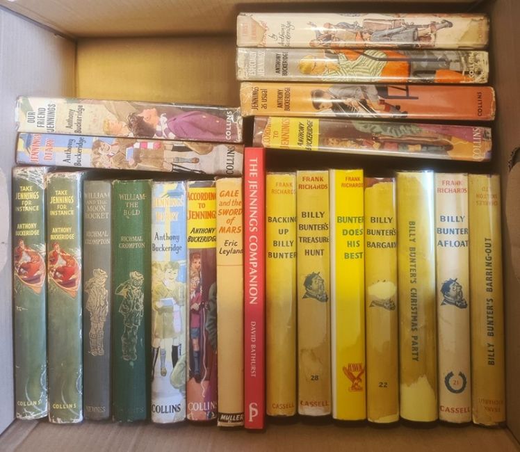 Buckeridge, Anthony Eight first editions "Jennings" to include "Jennings as Usual", "Take Jennings for Instance" (x2), "Our Friend Jennings", "Especially Jennings", all with dj not price clipped, other Jennings volumesRichards, FrankNine Billy Bunter stories, with djCrompton, Richmal Various William adventures to include "William and the Moon Rocket", George Newnes 1954, green cloth, no dj, "William the Bold", 1950, green cloth, no dj (1 box)