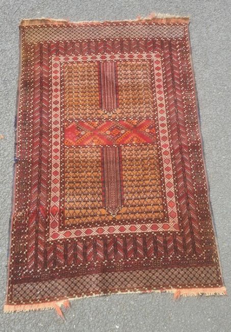 Rug, the central field with bands of decoration within multiple borders, in reds, blue and cream, 182cm x 114cm