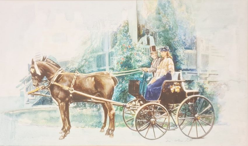 Melvyn Warren- Smith ( illustrator and artist, present day)Oil on paperBook illustrations" Playmates" signed lower right43 x 68 cmsUntitled - pair carriage horses and trap, with gentleman and lady with Belle Epoque house in the background, 37 x 63 cms