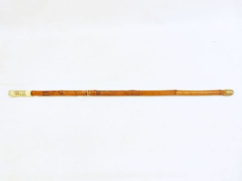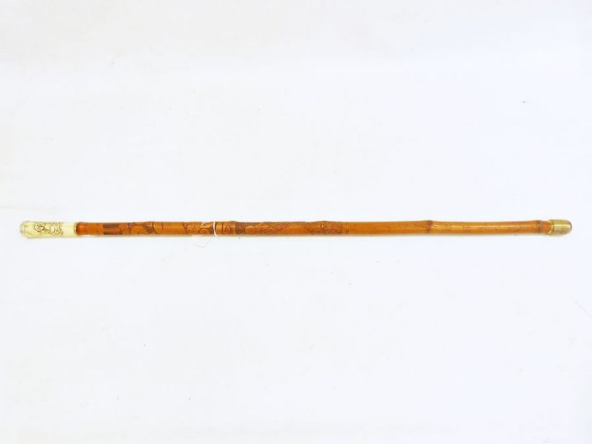 20th century Japanese walking cane, bone handle with white metal top, carved bamboo body with ox and bird and script
