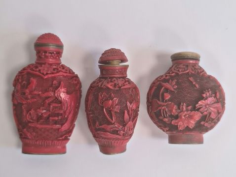 Chinese carved cinnabar lacquer snuff bottle, slender ovoid with panels of flowers, 6.5cm high, Qianlong mark, a Chinese Qianlong marked carved cinnabar lacquer snuff bottle, disc shaped, 6cm high and a Chinese carved cinnabar lacquer snuff bottle, lakeside landscape decoration, Qianlong mark to base, 7.5cm high (3)
