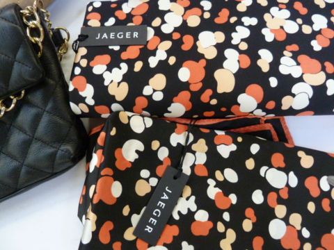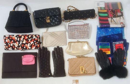 Jaeger scarf and matching clutch bag, assorted handbags, assorted scarfs to include Chanel, Jaeger, etc. (2 boxes)Condition ReportJaeger bags genuine, see imageToo many items to check individually, but overall seem to be in fair/good condition