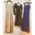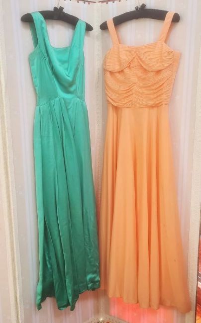1950's vintage and later, a blue satin textured evening dress with frilled bodice and drop waist, a black silk cocktail dress fitted at the waist, asymmetric buttons, V-neck, sleeves, ballerina-length, a blue lace cocktail dress, a satin full-length evening dress, a pink chiffon evening dress labelled Robert Dorland, a green satin full-length evening dress labelled Elmoor, London, a figured damask turquoise full-length evening dress and a patterned chiffon cocktail dress with full skirt, fitted bodice with ruched detail (8)
