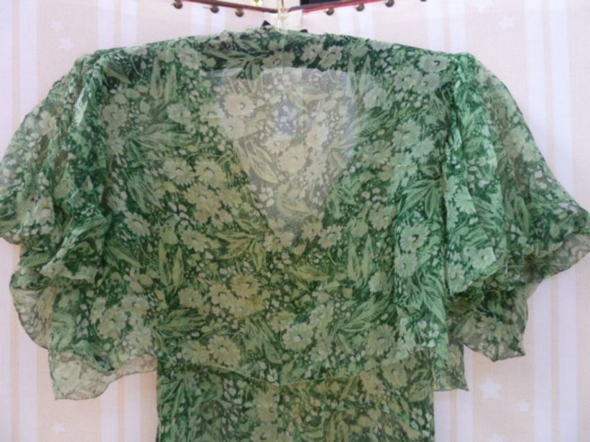 1930's printed chiffon tea dress, cowl neck with a chiffon covered weight to keep the shape intact, sleeveless with matching bolero, sleeves elasticated, bias cut, tiered and flounced skirt.Condition ReportOverall in good condition commensurate with age; some fading of fabric under the arms, two small holes to both sides of the waistline (where fabric is seamed), some minor loss of stitching and repairs to hem (belt missing)