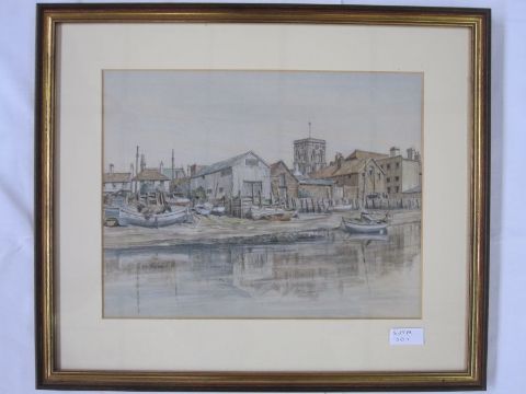 E W Moy (20th century school)WatercoloursTwo street scenes, possible Winchcombe and a fishing harbour scene, all signed, 26 x 38.5cm, 28.5 x 38cm and 25.5 x 33cm (3)
