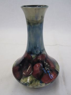 Moorcroft pansy pattern vase, tapered, green signature to base, 15.5cm high Condition ReportTo naked eye inspection; Slight rubbing to inside top edge. general crazing throughout