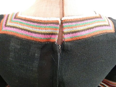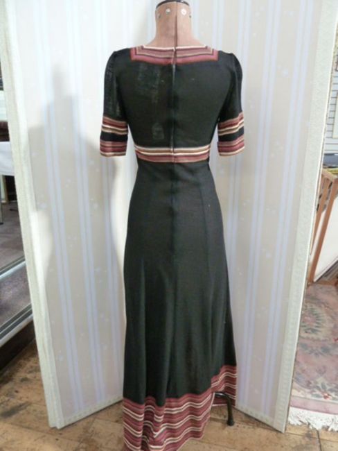 Jean Varon, black acrylic and viscose maxi dress, labelled, striped hem, banded sleeves, neckline, with another label 'Saks Fifth Avenue, Made in England'., with black and patterned maxi dress, labelled Leo , with balloon sleeves , front panel patterned and the back of the dress, ribbon ties, zip fastening, early 1970's (2)Condition ReportAppears to be in overall good condition; some slight stretching of fabric along the upper part of the zip line